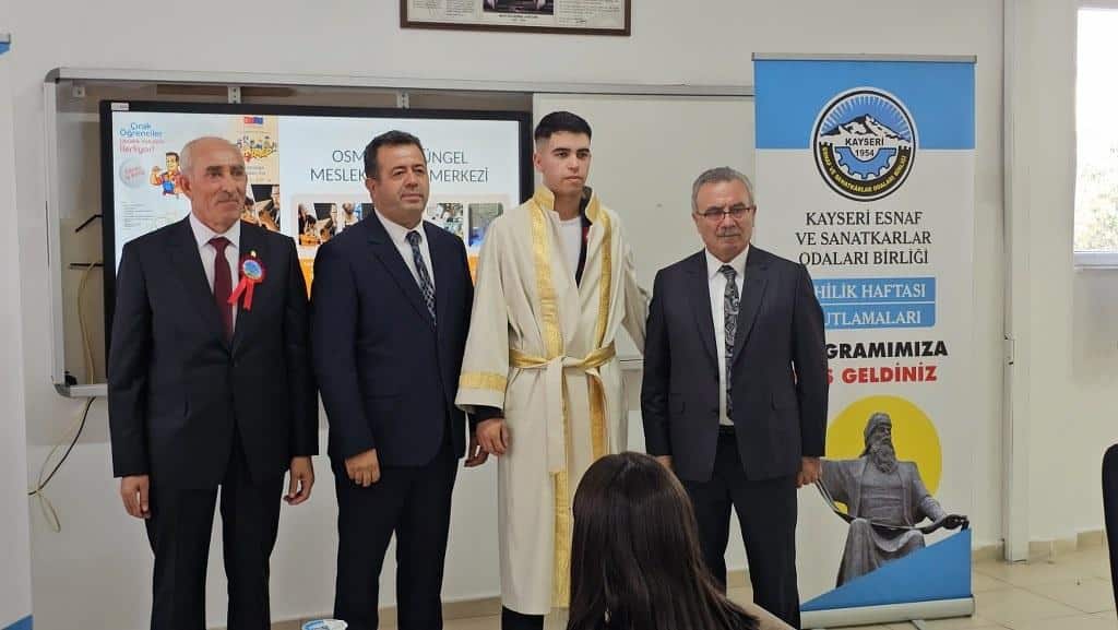 Osman Düşüngel Mesleki Eğitim Merkezi’nde Ahiler Haftası Kutlama Programımız gerçekleştirildi. Etkinliklere, İlçe MEM Şube Müdürümüz Sn. Muhtesin DÖNER , Kayseri Esnaf ve Sanatkârlar Kredi ve Kefalet Kooperatifi Yönetim Kurulu başkanı Sn. Mustafa Alan, Kayseri Esnaf ve Sanatkârlar Odaları Birliği Başkanı Sn. Şeyhi Odakır ve diğer odalar birliği başkanları katıldı. Etkinliğimizde Tören ve Protokol konuşmalarından sonra Haziruna ve Öğrencilerimize Ahi Pilavı ve Helvası ikram edildi. Okul Aile Birliği Başkanımız Sayın Erol YENER'e Merkezimize yaptığı katlıkardan solayı plaket takdim edildi.
